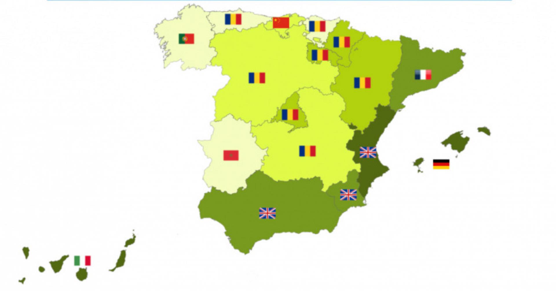 In Andalusië en de regio Valencia waren Britse, Zweedse en Belgische expats degenen die de meeste huizen kochten. In Catalonië de Franse, Chinese en Italiaanse bevolking. Op de Balearen en de Canarische eilanden vooral Duitsers, Britten en Italianen.