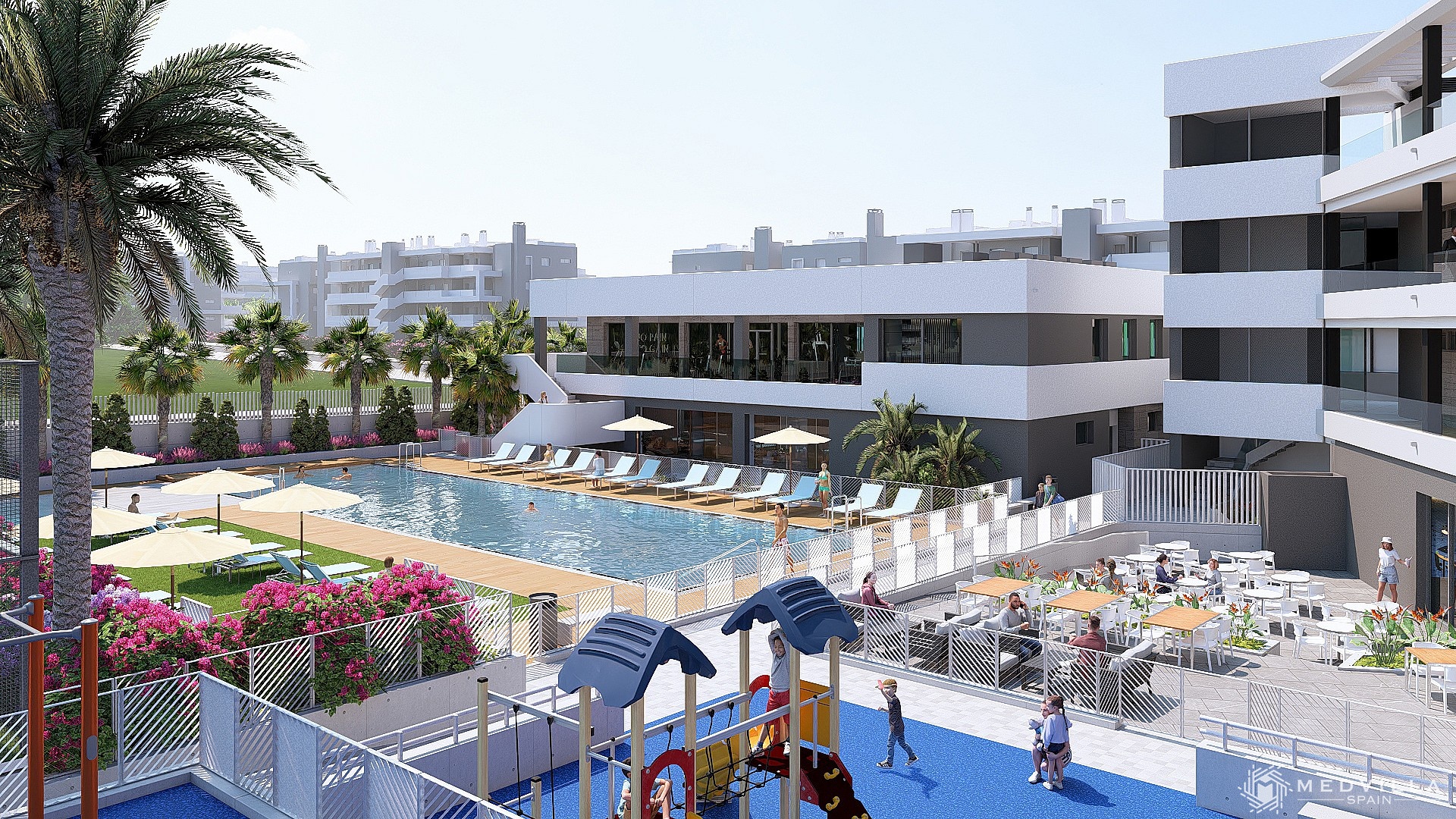 Lagoons Village - SLEUTELKLAAR Appartement met terras voorzien van 2 Slaapkamers en 2 Badkamers, gemeenschappelijk zwembad en ondergrondse parkeerplaats, gelegen te Torrevieja aan de Costa Blanca Zuid in Spanje.
