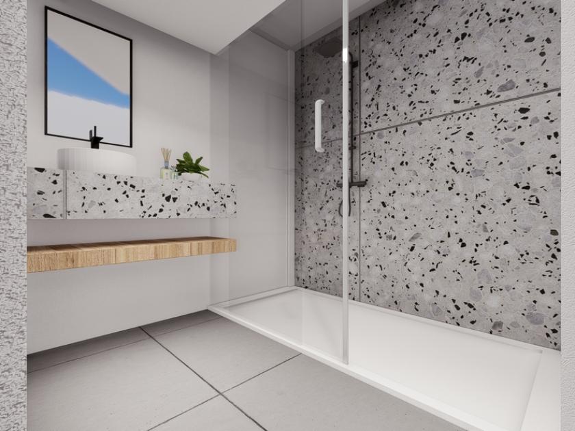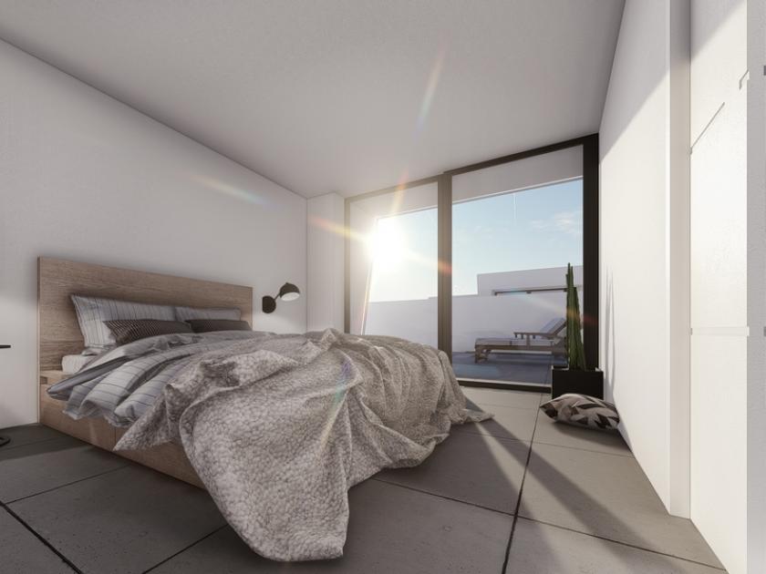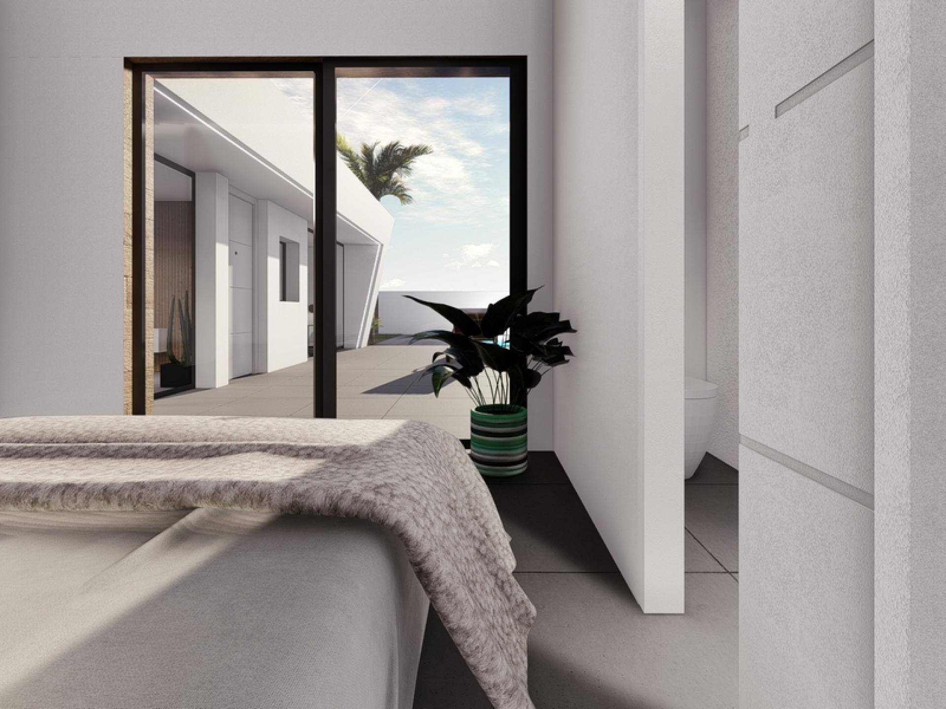 Luxe bungalows met prachtig bergzicht op 15 minuten rijden van de Los Alcazares stranden. Ze hebben een living met moderne open keuken en schuiframen die toegang geven naar het frontterras en privé zwembad. Vanop het zonnedakterras hebt u prachtig bergzicht.