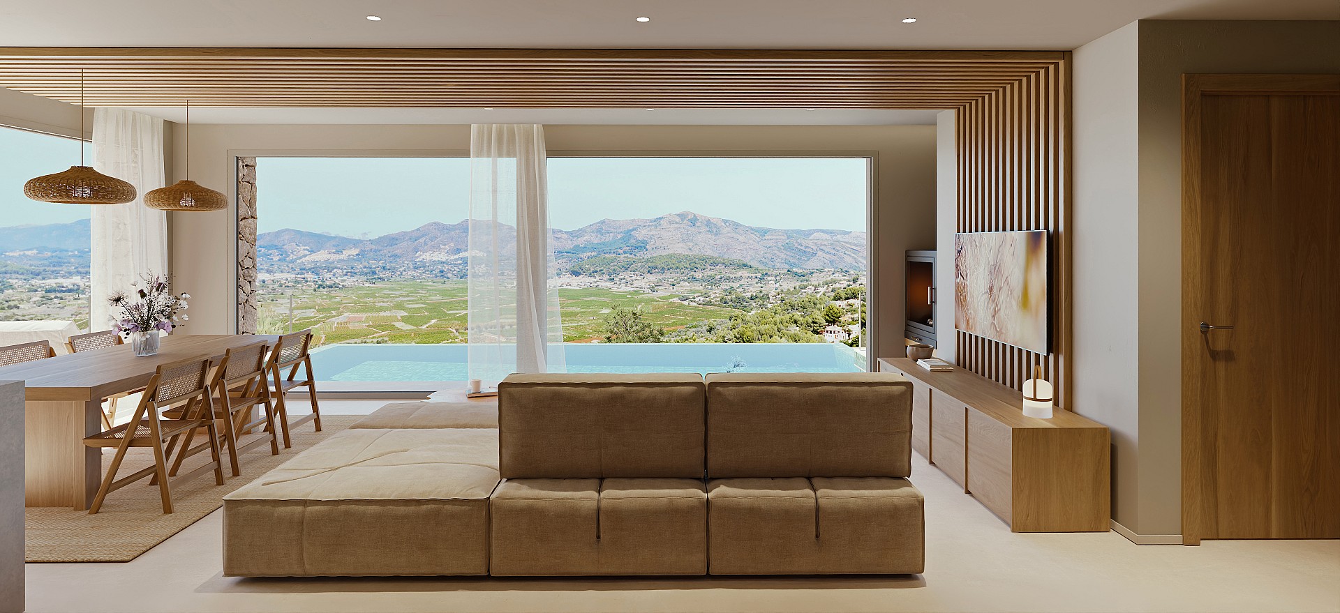 Integratie in het landschap. Ontworpen om op te gaan in de omgeving past de woning zich aan het hellende terrein aan en creëert buitenplateaus die het leven richting de Vall de Pop verlengen. Droge-stenen muren, houten pergola’s en groendaken gaan een dialoog aan met de natuur. Het infinity-zwembad en xeriscapetuinen maken de horizon tot onderdeel van de dagelijkse beleving.