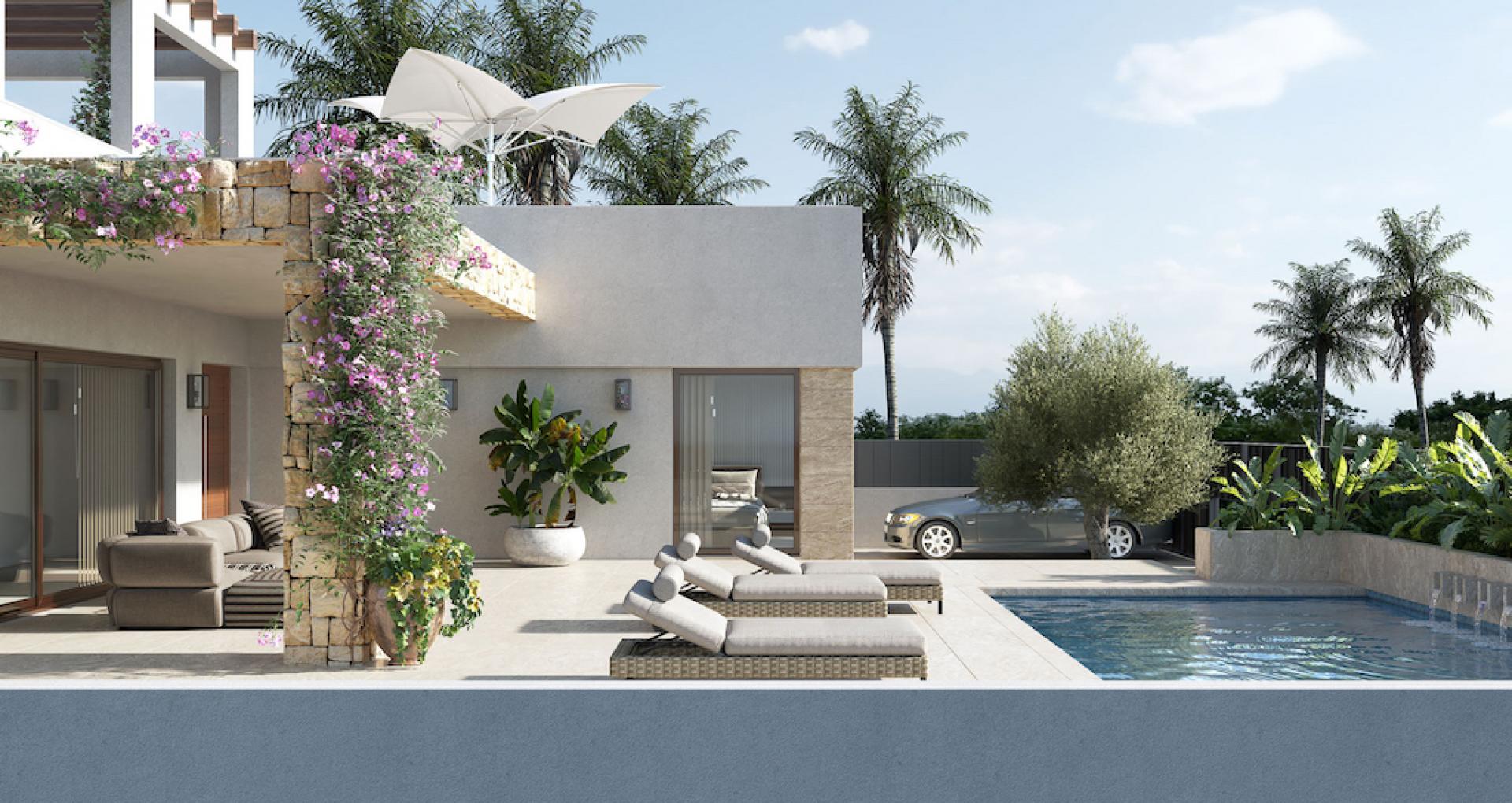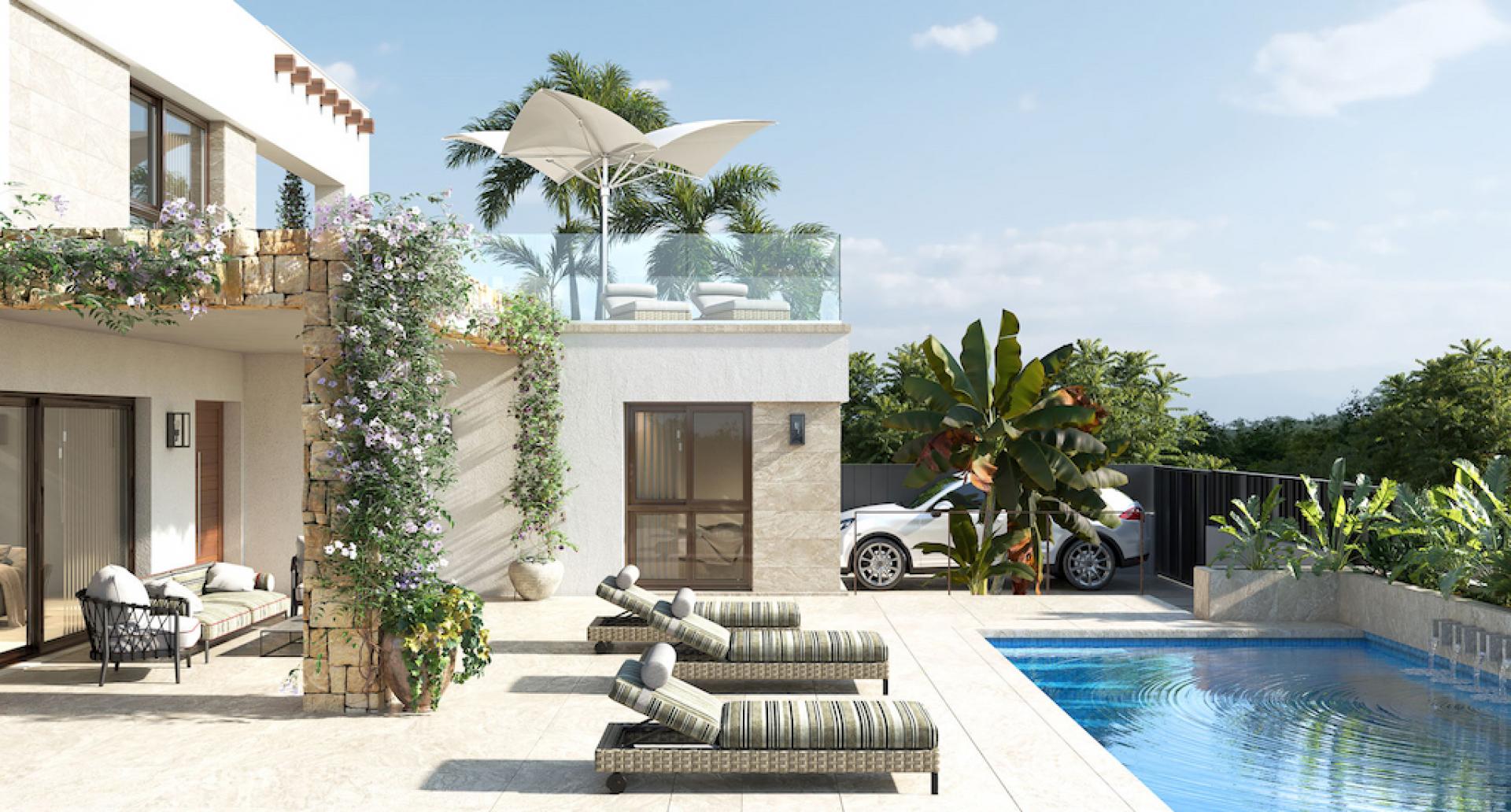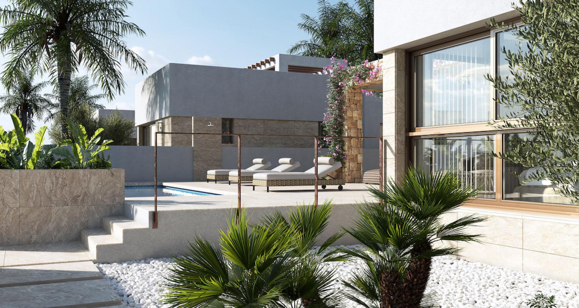 Er is keuze tussen villa's in één verdieping of twee verdiepingen. Elke villa bestaat uit woon-eetkamer met open keuken, 3 slaapkamers en 3 badkamers, een berging, een solarium en een ruime tuin met verschillende terrassen, een privézwembad en een parkeerplaats voor de auto.