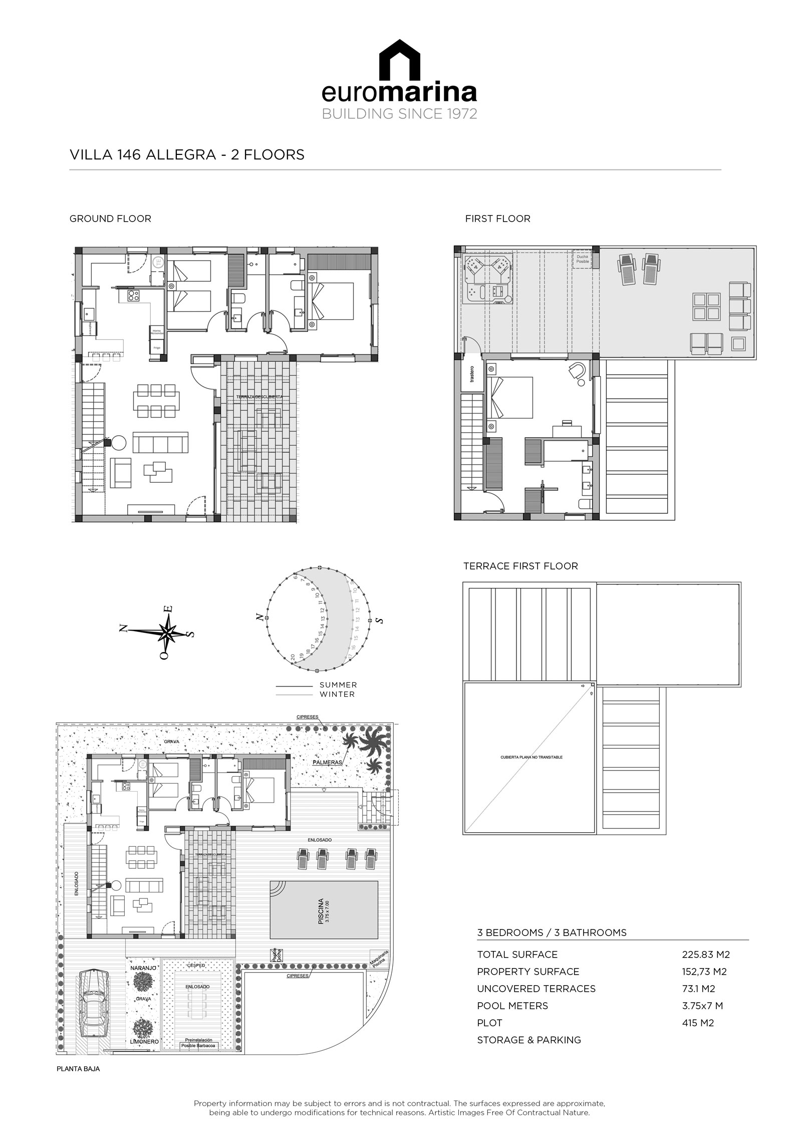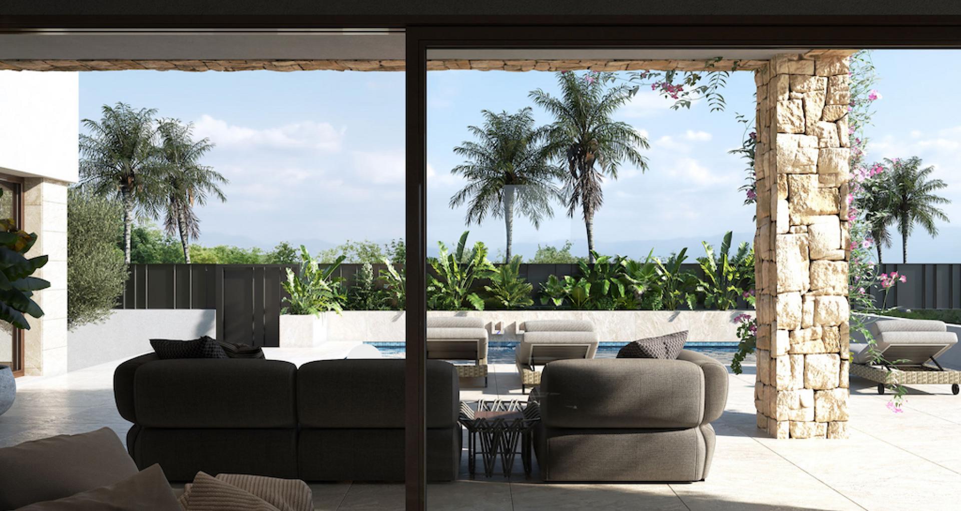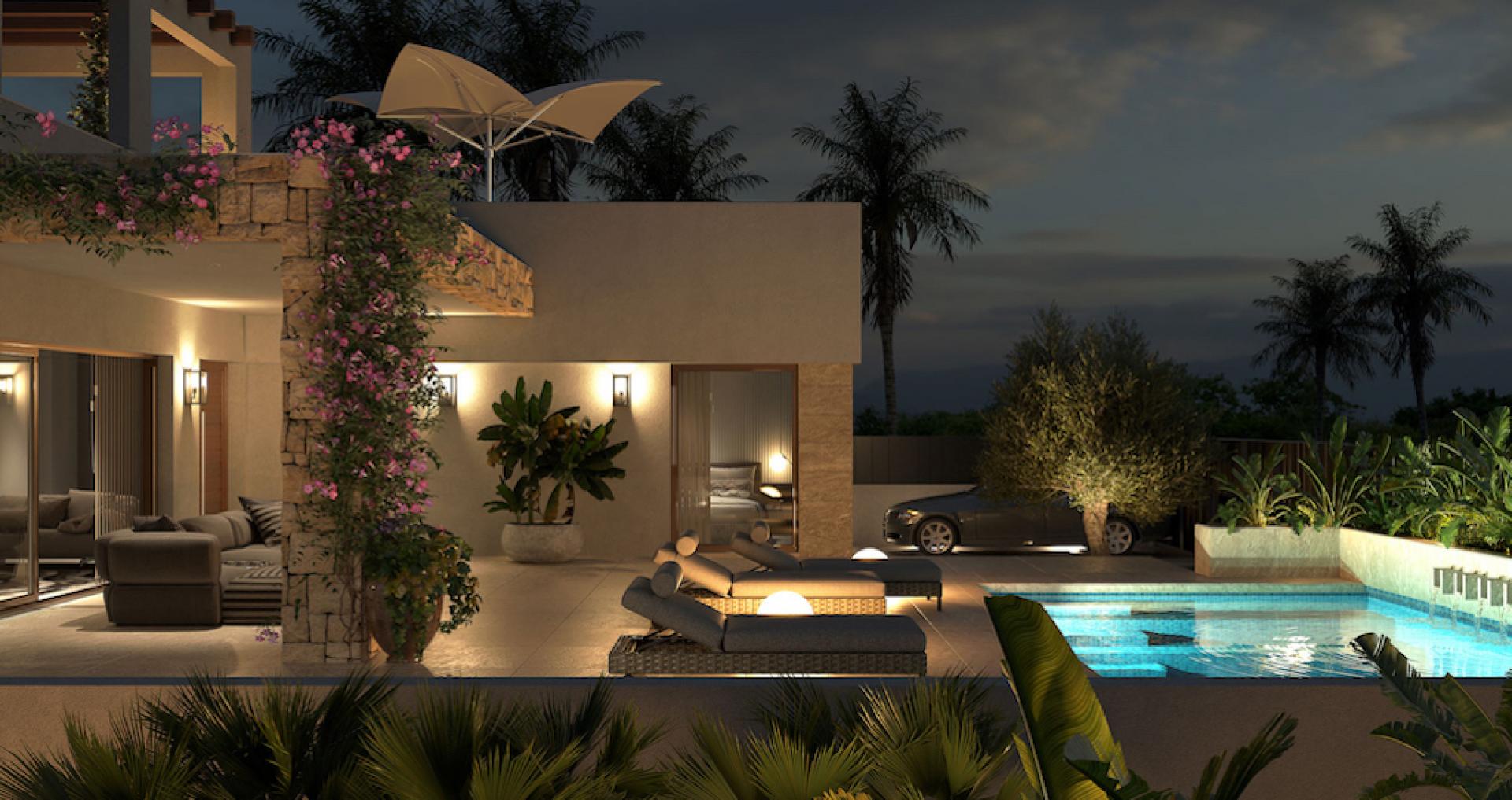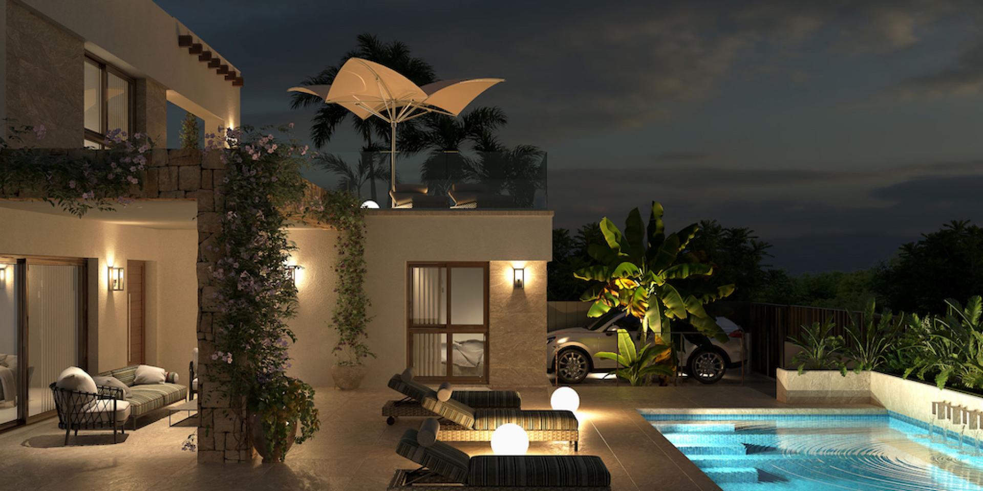 Er is keuze tussen villa's in één verdieping of twee verdiepingen. Elke villa bestaat uit woon-eetkamer met open keuken, 3 slaapkamers en 3 badkamers, een berging, een solarium en een ruime tuin met verschillende terrassen, een privézwembad en een parkeerplaats voor de auto.