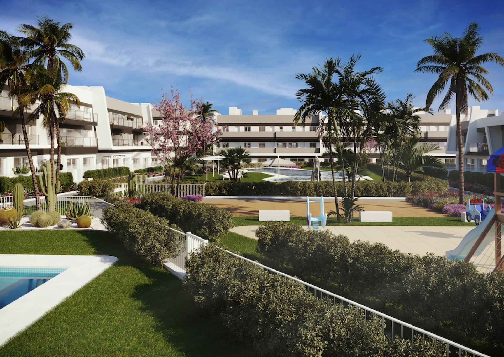 Deze moderne woningen bieden een keuze uit 2 of 3 slaapkamers en diverse indelingen, waaronder gelijkvloerse appartementen met tuin, tussenverdiepingen met terras of bovenste verdiepingen met een dakterras. Elk appartement is uitgerust met volledige airconditioning installatie, afgewerkte badkamers en een moderne keuken met hoogwaardige apparatuur. Bovendien biedt dit project verschillende aangelegde tuinen, een verfrissend gemeenschappelijk zwembad en een speeltuin voor de kinderen, allemaal binnen handbereik.