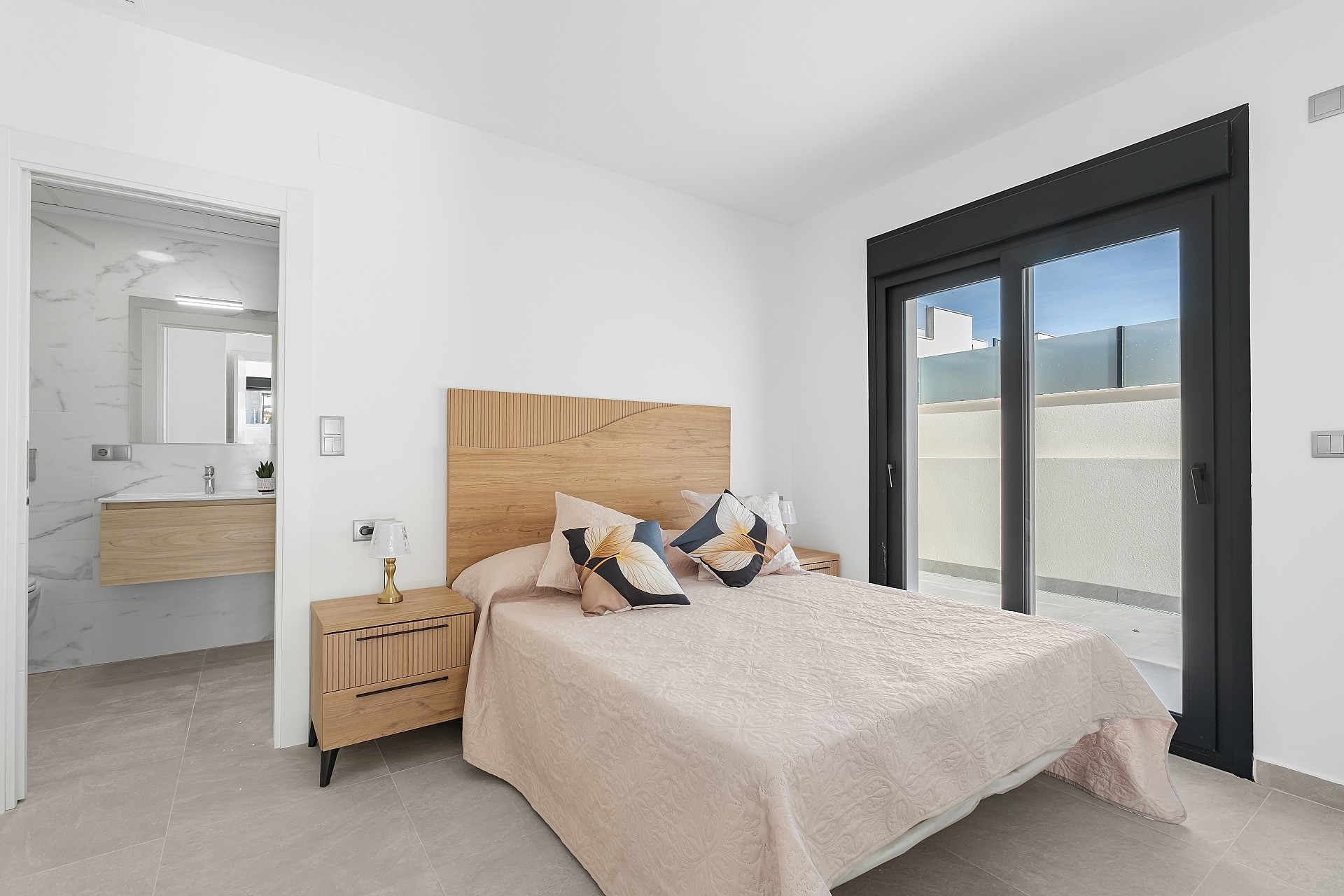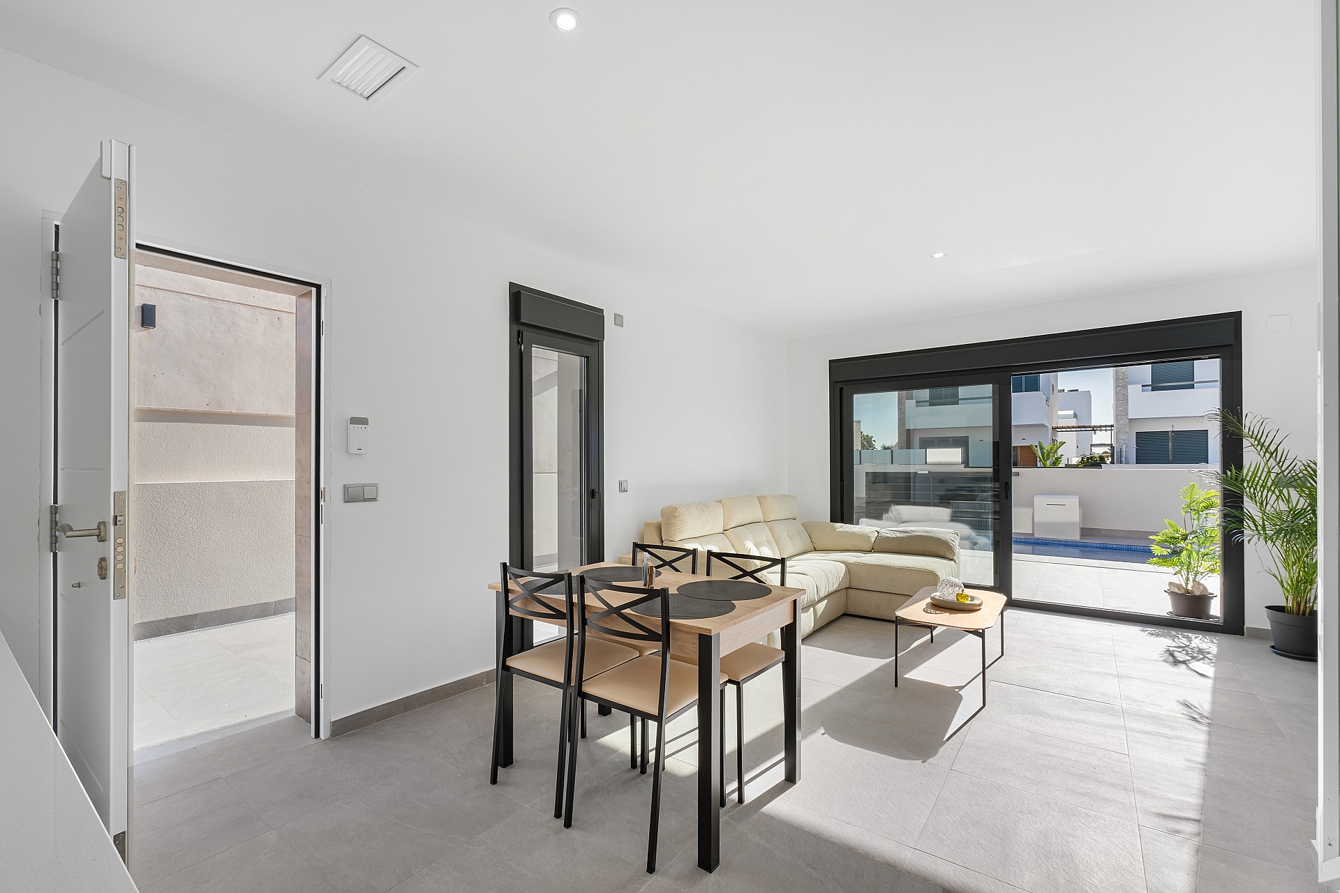 Iedere woning beschikt over drie slaapkamers en twee badkamers. Op de begane grond vind je een lichte woonkamer met open keuken, perfect voor gezellige avonden en direct contact met het terras en de tuin. Hier geniet je bovendien van je eigen privézwembad, ideaal voor ontspanning en verkoeling op warme dagen.