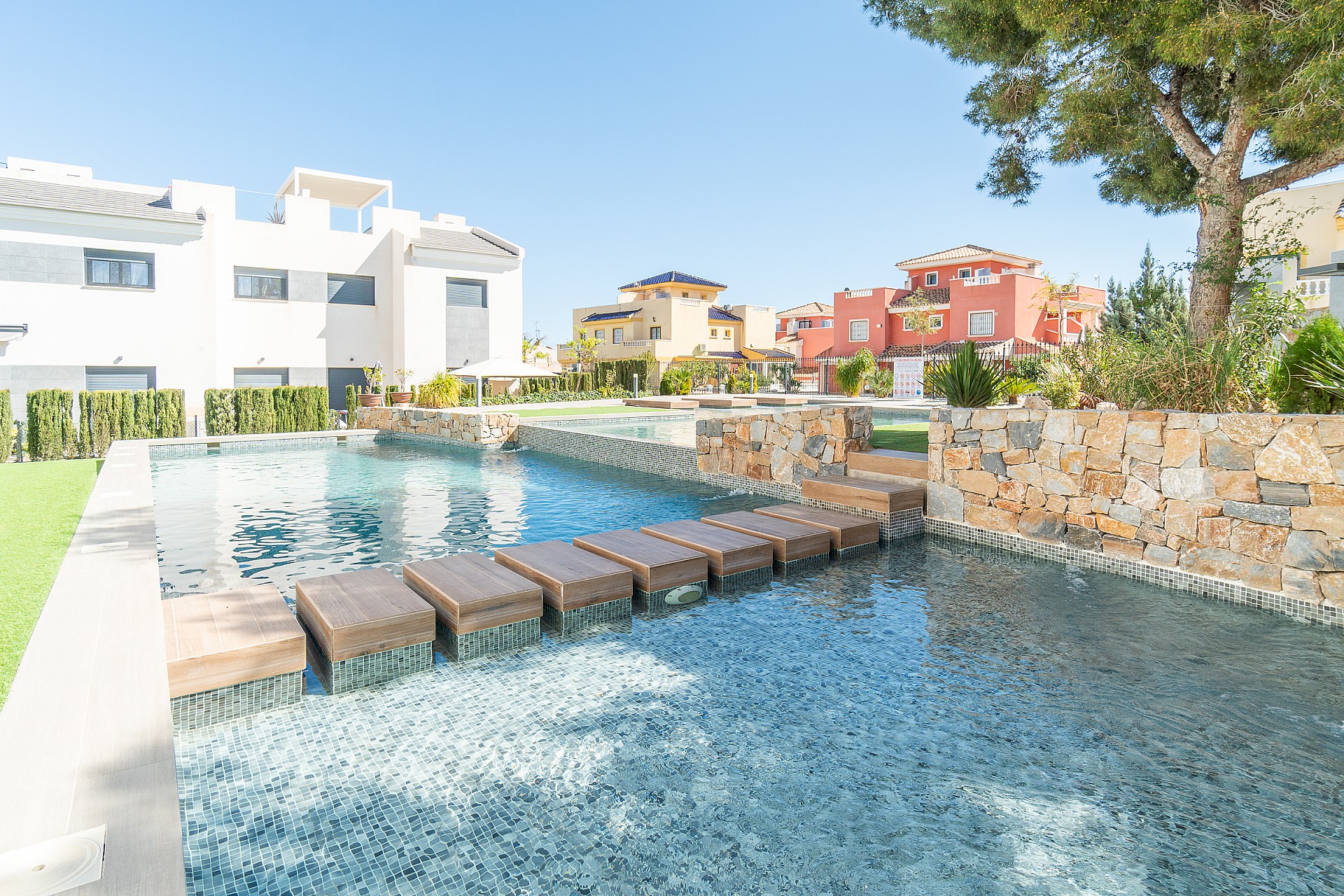 De woonwijk Balcón de la Laguna heeft mooie aangelegde gemeenschappelijke ruimtes, 5 zwembaden met 1 verwarmde jacuzzi, verschillende groene zones en sfeervolle buitenverlichting.