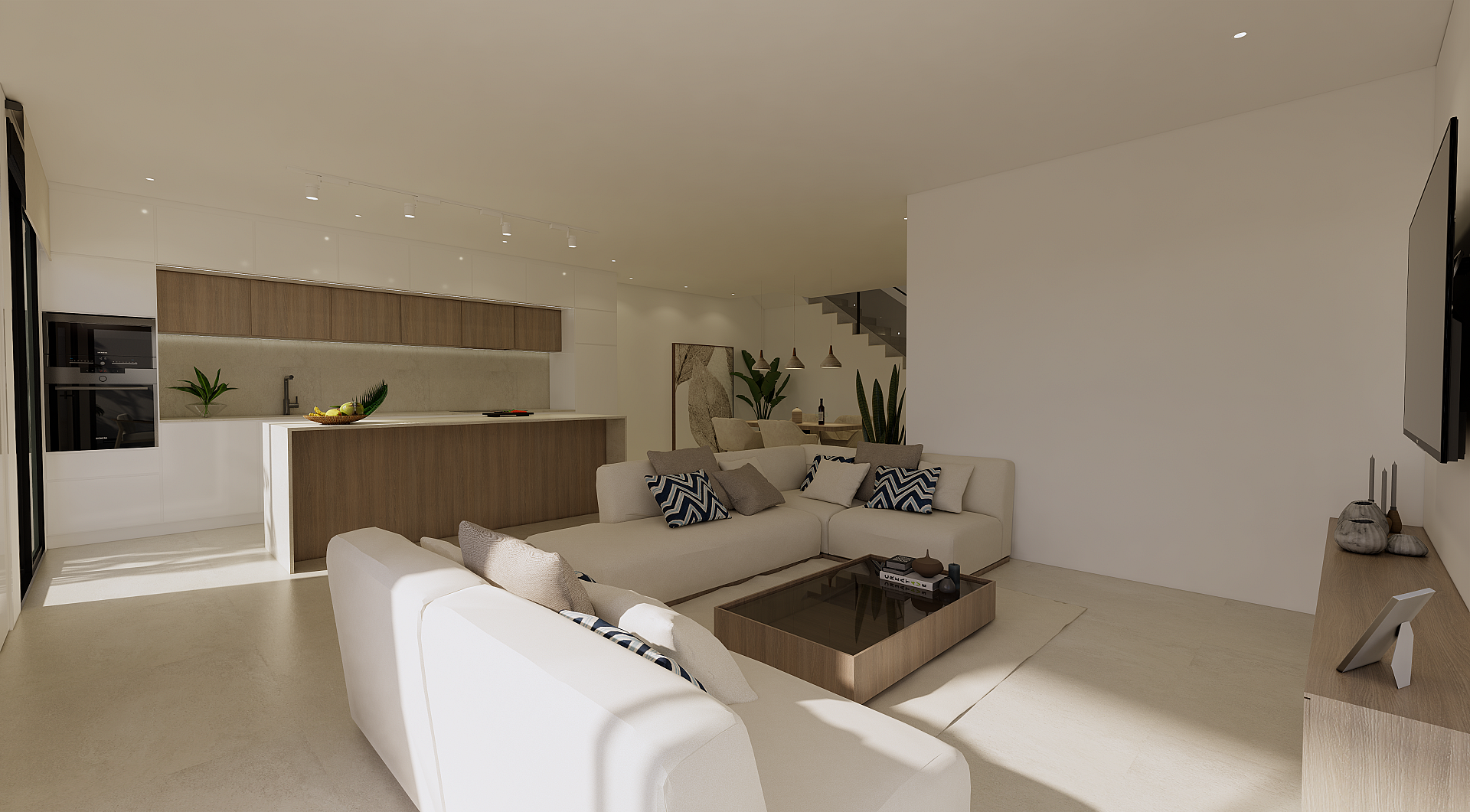 De villa’s zijn verdeeld over twee verdiepingen met een lichte open keuken, ruime woon-eetkamer, 3 slaapkamers, 3 badkamers en een groot terras van 60 m². Buiten vindt u een privézwembad, aangelegde tuin en parkeerplaats op het perceel.