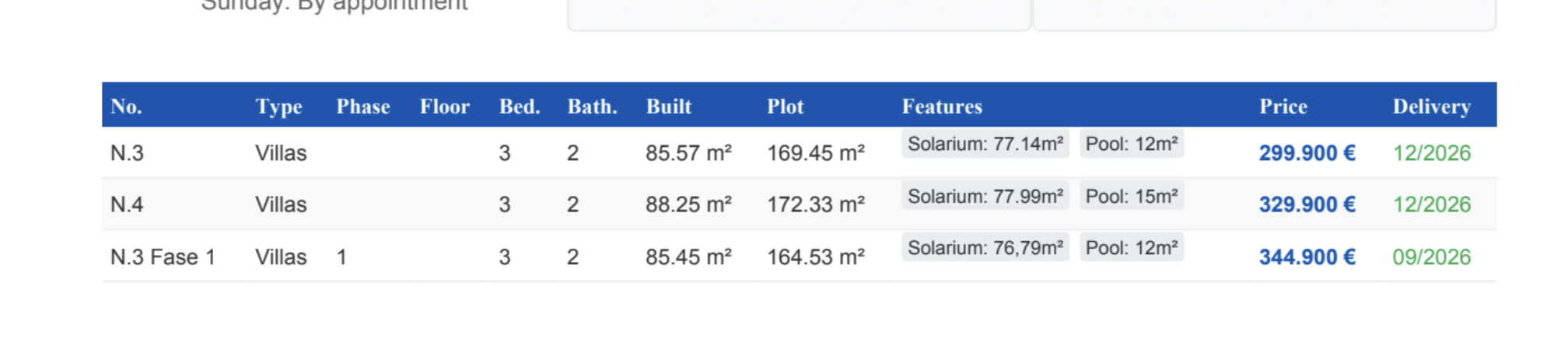 | Villa | 3 | 2 | 85 m² | 77 m² | 170 m² | 299,900€ | Meer info... |