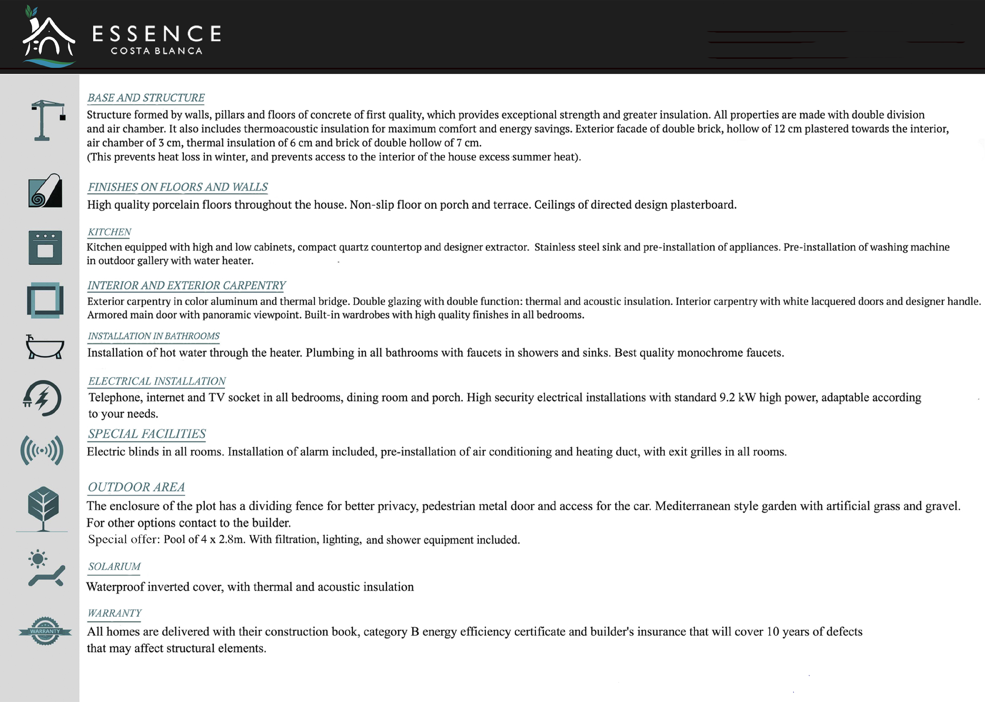 Elke villa is voorzien van 3 slaapkamers en 3 badkamers, waarvan twee en-suite. Deze moderne woning harmonieert perfect met de natuurlijke schoonheid van de Costa Blanca, wat resulteert in een rustige omgeving en een uitzonderlijke woonervaring.