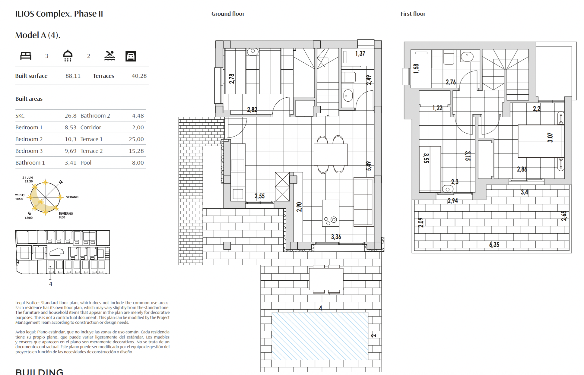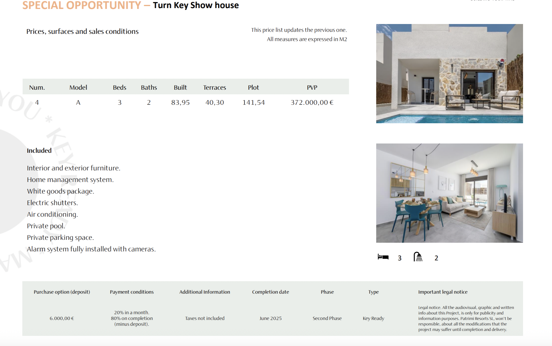 Speciale aanbieding: volledig uitgerust inclusief binnen- en buitenmeubilair, witgoedpakket en airconditioning. Belangrijkste specificaties: Domoticasysteem (Home Management System), Geïntegreerde airconditioning, Elektrische rolluiken, Witgoed inbegrepen, Alarm met camera’s, Gemotoriseerde toegangspoort, Gemeenschappelijke zone met zwembad.