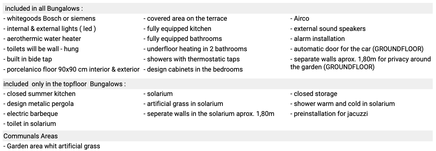 In dit complex kan u kiezen uit een gelijkvloers appartement met tuin en automatische poort of op de eerste verdieping een appartement met privé dakterras die voorzien is van een zomerkeuken, buitendouche en pergola. Zowel de gelijkvloerse appartementen als de penthouses hebben een ruime woonkamer met aansluitend de eetkamer en open keuken, 3 slaapkamers en 2 badkamers. Alle woningen zijn voorzien van een parkeerplaats, keukentoestellen, volledig afgewerkte badkamers met vloerverwarming, binnen- en buitenverlichting, volledige airco installatie en sound speakers buiten.