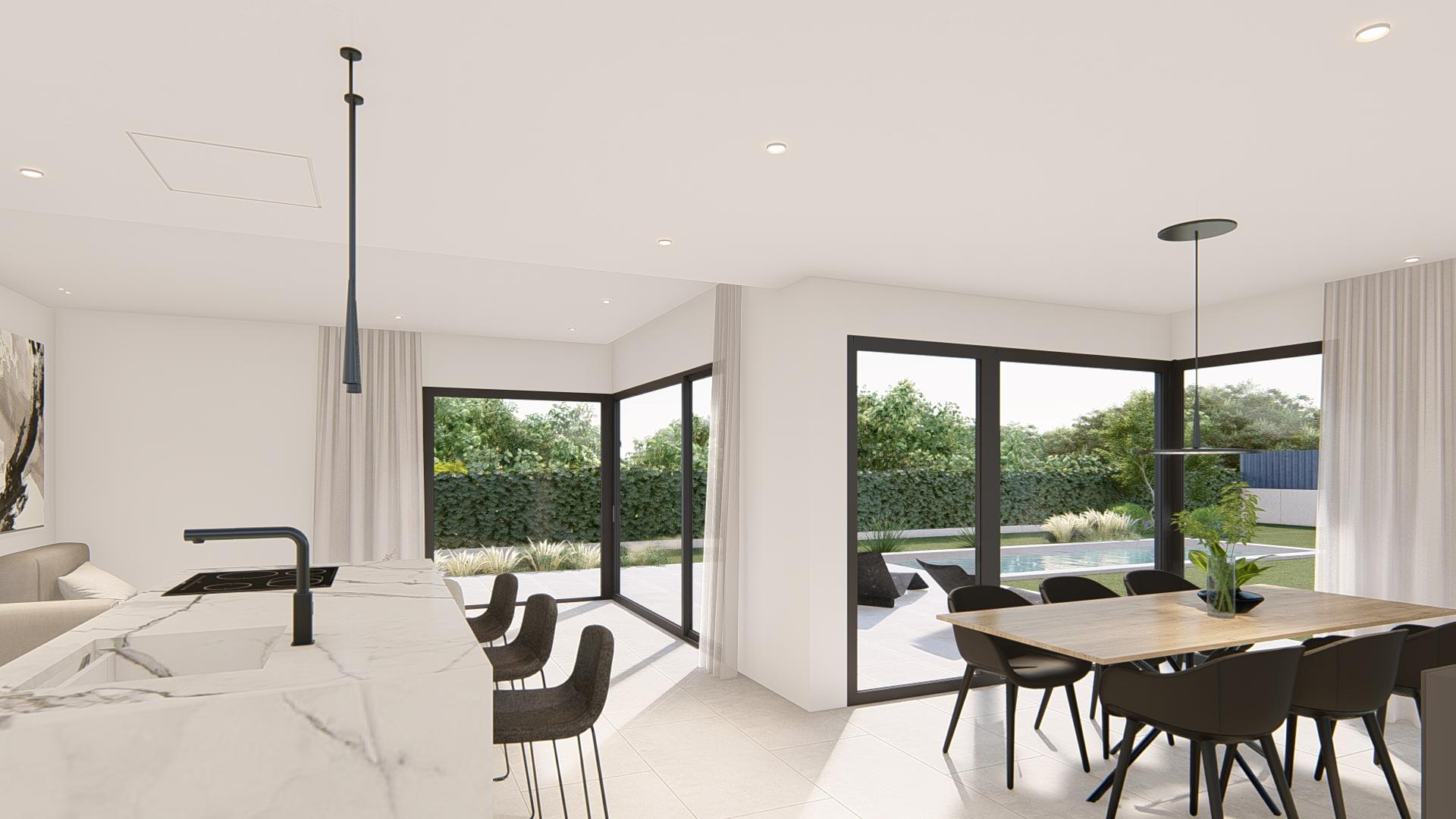 Het Aledo-model biedt eveneens een hoge standaard van comfort en design. Ook hier is een privézwembad van 6x3 meter aanwezig en de badkamers zijn volledig uitgerust met moderne afwerkingen. De woning heeft een fraai aangelegde tuin met betegelde zones en kunstgras. Grote ramen in de woonkamer laten veel natuurlijk licht binnen en creëren een ruimtelijk en uitnodigend gevoel.