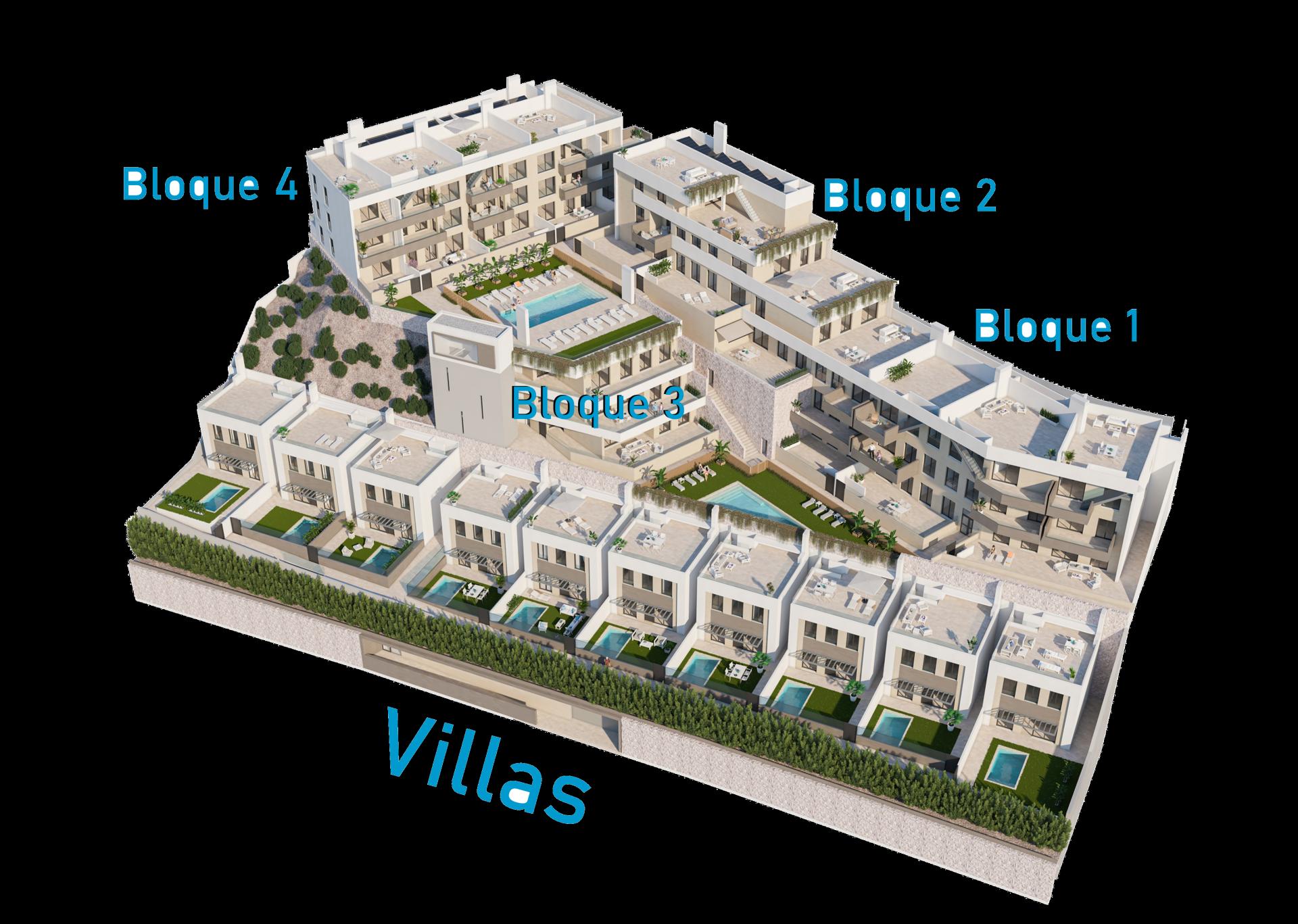 Deze exclusieve ontwikkeling met appartementen van 2 en 3 slapkamers en 2 badkamers biedt een gemeenschappelijke garage met parkeerplaats en berging voor elke woning; en 10 elegante villa's met 4 slaapkamers en 3 badkamers, elk met een eigen privézwembad.