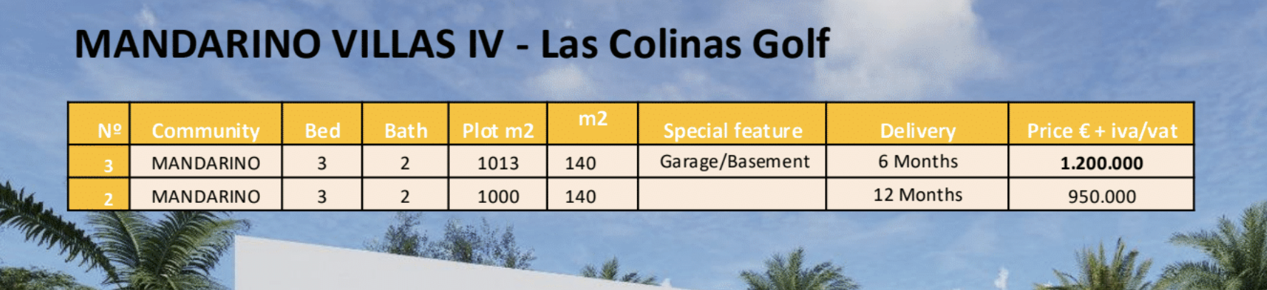 Ontdek de luxe villa's op het Las Colinas Golf Resort, perfect gepositioneerd op ruime percelen van minimaal 1000 m² voor optimale privacy. Deze villa's zijn ontworpen met oog voor detail en bieden 3 ruime slaapkamers en 2 stijlvolle badkamers. Voor degenen die extra ruimte wensen, is er de mogelijkheid om een kelder of garage te bouwen tegen een meerprijs.