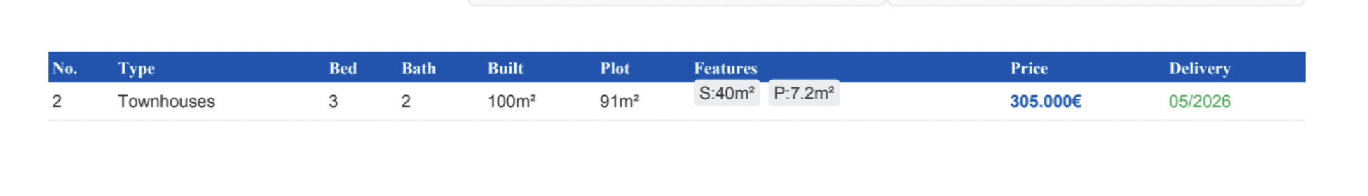| Villa | 3 | 2 | 100 m² | 40 m² | 91 m² | 305,000€ | Meer info... |