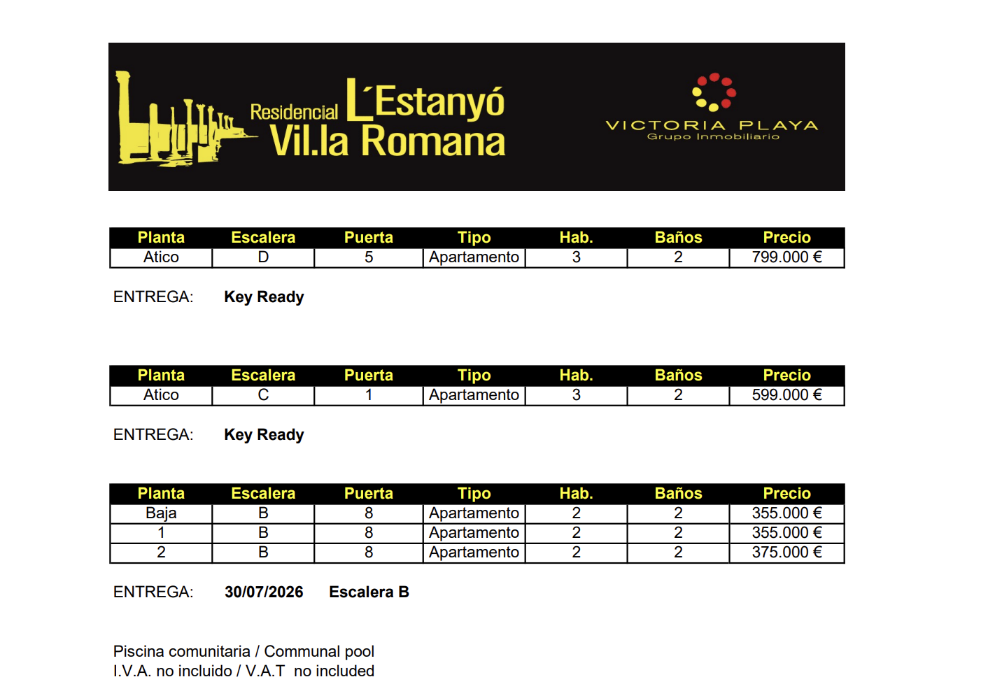 In opdracht van de projectontwikkelaar bieden wij met trots het project Residencial LEstanyo Villa Romana aan. Zie je ergens een lagere prijs? Dan is de kans groot dat die collega-makelaar zijn prijzen nog niet heeft bijgewerkt.